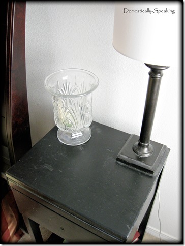 The lamp base I got at a garage sale for $1 ~ a little Oil Rubbed Bronzed spray paint made her shine. The shade is from the Pottery Barn Outlet for 49 cents ~ YES ~ 49 cents! Crazy… I grabbed the 3 they had left. Eventually I’ll add something to the lampshade. Our master bedroom is one of those projects that I’m still needing inspiration to start. I’m not sure exactly what style I want to do… I want new bedding and then I’ll pick paint color ~ oh well, one room, one project at a time!