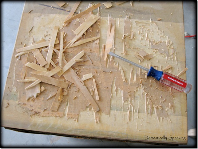 So I took her home and sanded her down, but the top still needed a bunch of work. I took a screwdriver to chisel the top and try to remove the chipped tabletop.