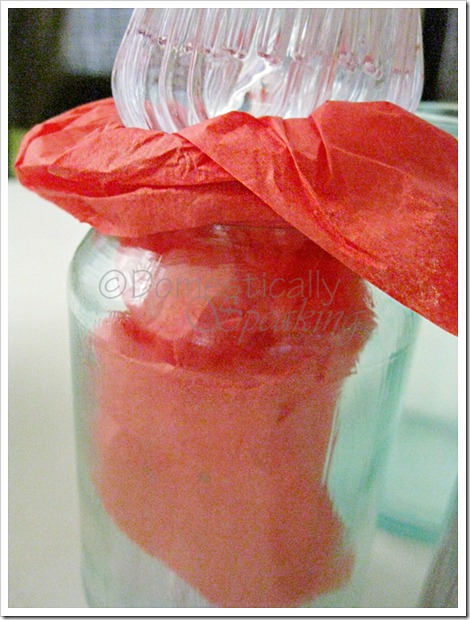 I used some of the bottles to hold the utensils with a bit of red tissue paper.