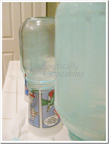 I put them upside down on some kid cups. This made it easier to paint on and the perfect place for the jars to dry. The closest jar in the photo above had just been brushed, where the one behind had already started to dry. I did 2 thin coats.