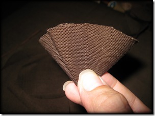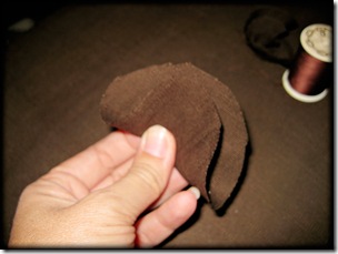 Then I took a needle with my almost matching brown thread and stitched it about 1/2 inches up from the bottom… about where my nail is pointing to above.