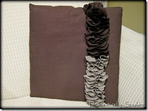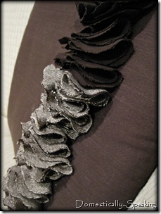 I’m sure there’s some technical sewing term to better describe this, but like I said… I don’t sew… so I went from front to back, back to front and then once more front to back. Then I sewed the rosette right onto the pillow. I stitched it on about 3 times, tying it off.