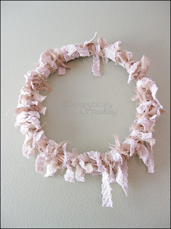 I had a little bit of burlap leftover from the son’s burlap curtain add-on and my burlap flower pin for my sweater pillow. There wasn’t enough to wrap it around, but I thought maybe cutting into strips would work. I made each strip about a 1/2 inch thick. Then I just tied the strips around the wreath.