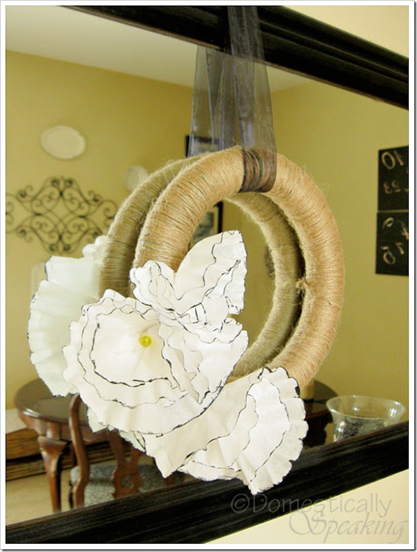 Those coffee filters make fab flowers! Oooo the possibilities 🙂 Love. The whole vignette with the mirror, hutch, etc is loverly.