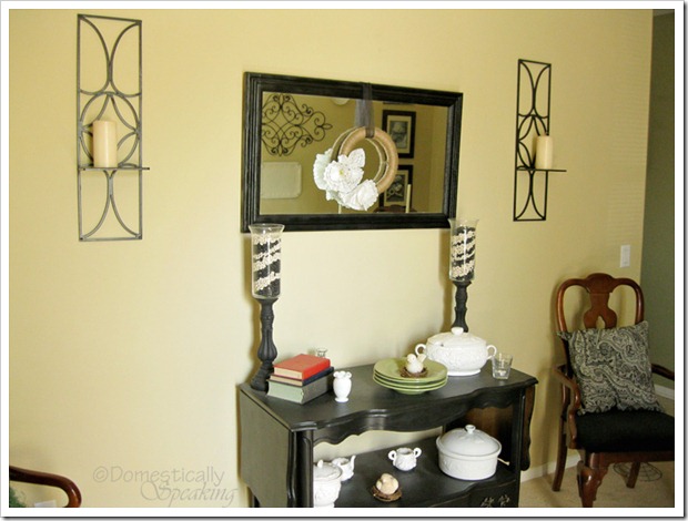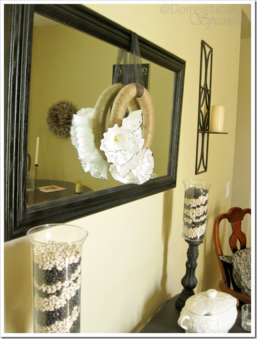 My frilly new wreath is hanging on my $5 garage sale mirror that use to be a gaudy gold.