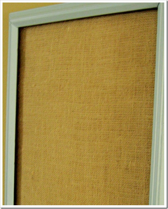 I let it dry about 20 minutes and then wrapped it with burlap ( I cut it to fit and ironed it). I used some thick masking tape to hold the burlap on the back of the foam board until I placed it in the frame.