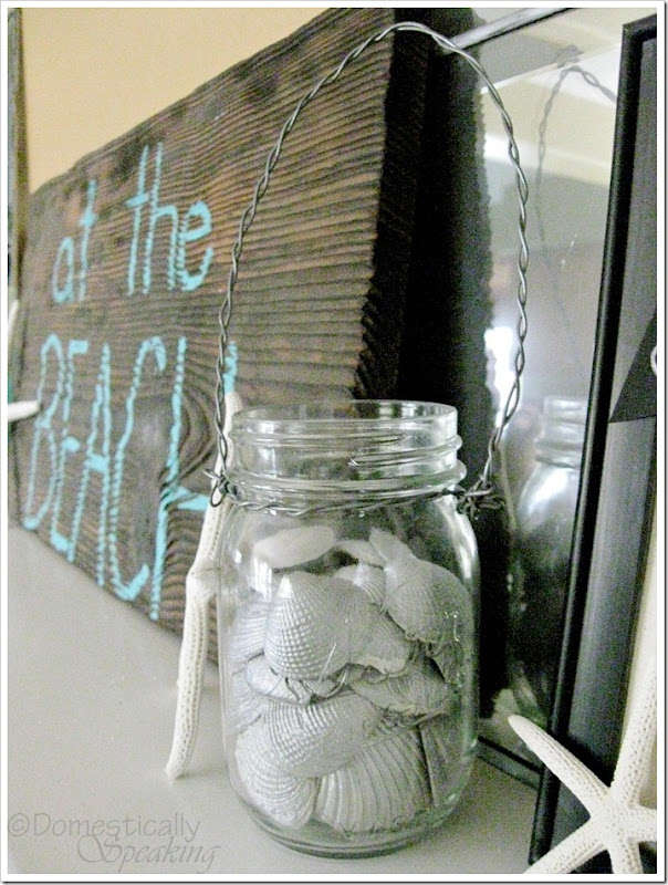 My Pottery Barn’ish mason jar candleholder can be found here and the silver shells here.