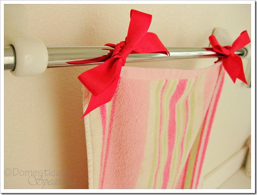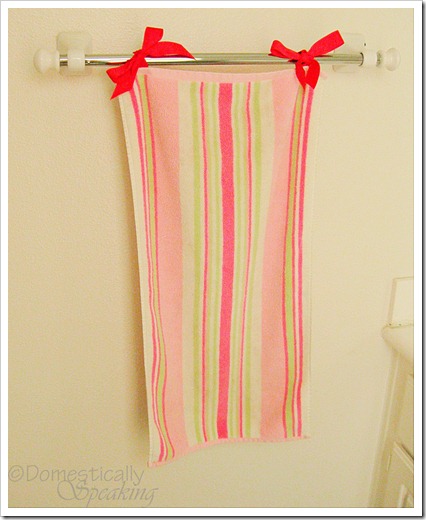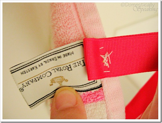 The ribbon really is a deep pink (a little darker than the darkest pink in the towel)… not sure why it’s lookin’ red’ish on my screen.