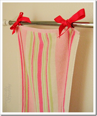 I cut a piece of ribbon about 15 inches long and then cut a 2nd ribbon at the same length. I folded the ribbon in 1/2 and just stitched it to the back of the towel.