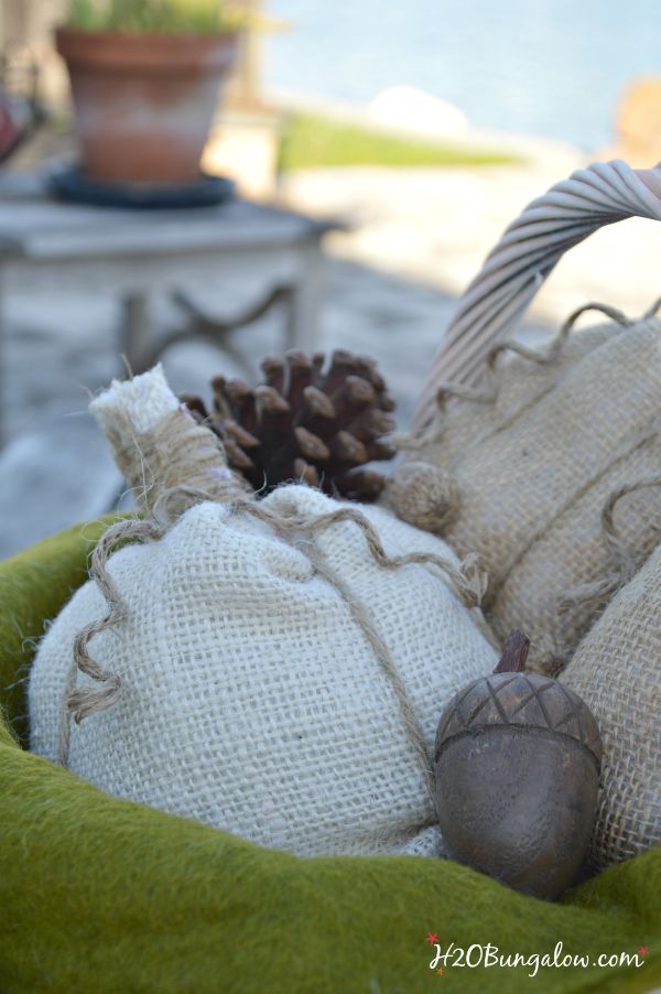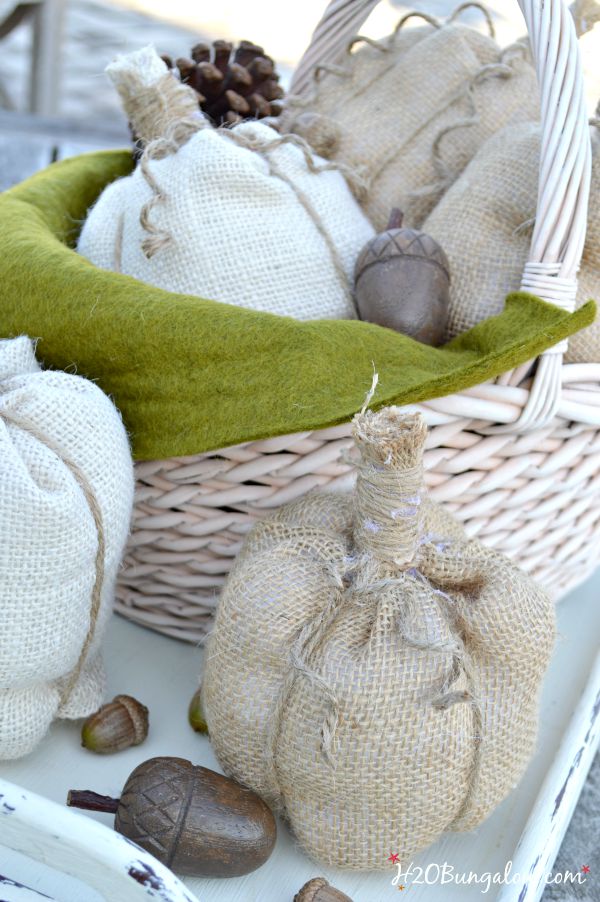 I think theyd look super in colored or patterned burlap too! Where would you put a basket of no sew pumpkins in your home?