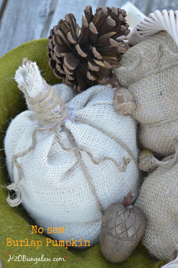 Hi there, I’m Wendi from H2OBungalow where I’m always cooking up some kind of creative home decor or home improvement project to pretty up our little 1950’s coastal bungalow. Nope, I can’t cook worth a darn, but I wield a mean paint brush and can transform or make just about anything my imagination dreams up and I’m constantly stirring up better ways to make living in a small house easier. Projects like my DIY Open Shelf Vanity I built for about $100, or my 5 Creative Ways To Deal With Sentimental Clutter are a few of my favorite posts. I”m here today sharing how to make a quick and easy no sew burlap pumpkin. These little darlings are adorable alone, in a group or as part of a seasonal vignette.