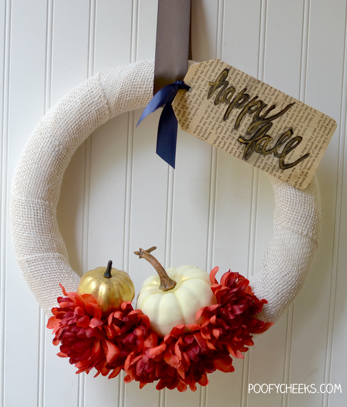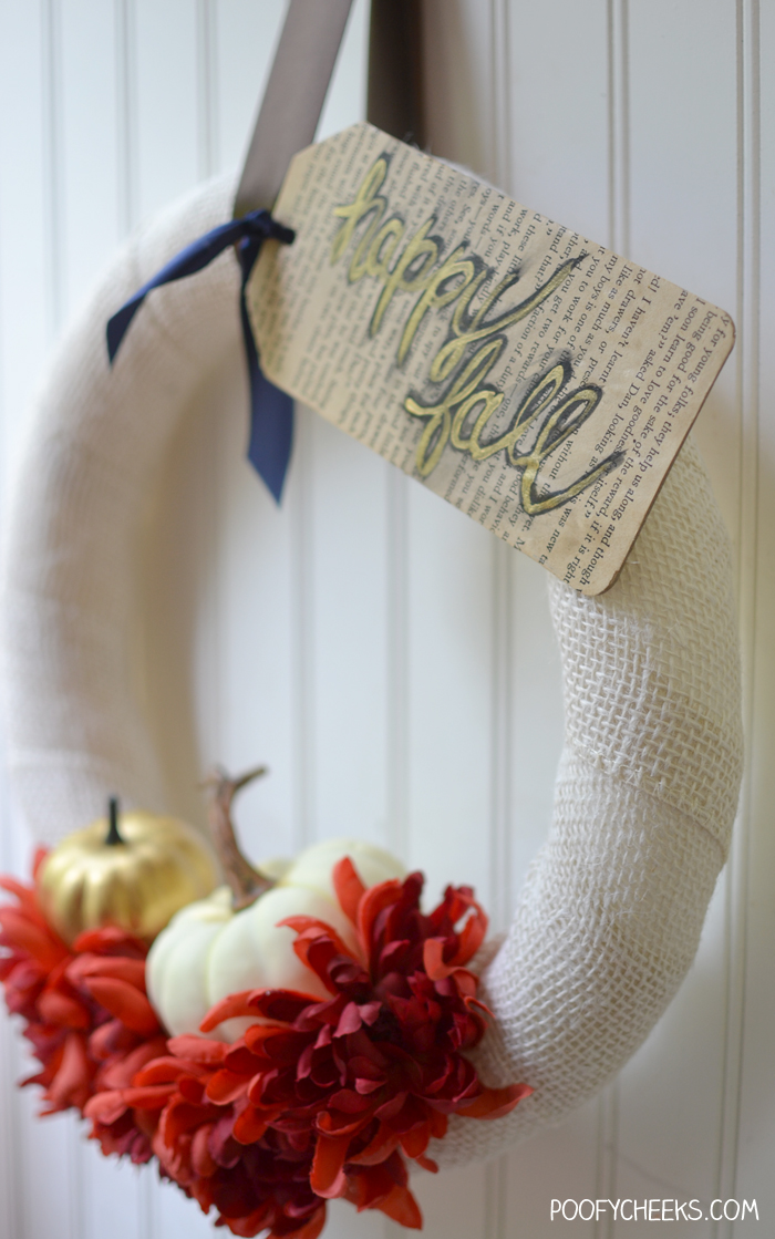 Happy Fall Y’all! Oh, how I have been longing to say that for months now. I am Kelsey from Poofy Cheeks and I am so excited to be taking part in the burlap series Maryann is hosting. I am sharing a really simple and elegant burlap fall wreath. Believe it or not I whipped this baby up in no time and bought most of the supplies during a trip to Walmart.
