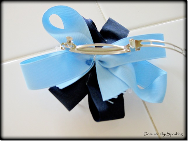 Then I did the same with the dark blue ribbon, just slightly smaller to layer. Then you just hot glue the dark blue bow on top of the light blue. I did mine at a 90 degree angle to make the whole bow appear fuller. Then you hot glue your barrette to the bottom of the bow.