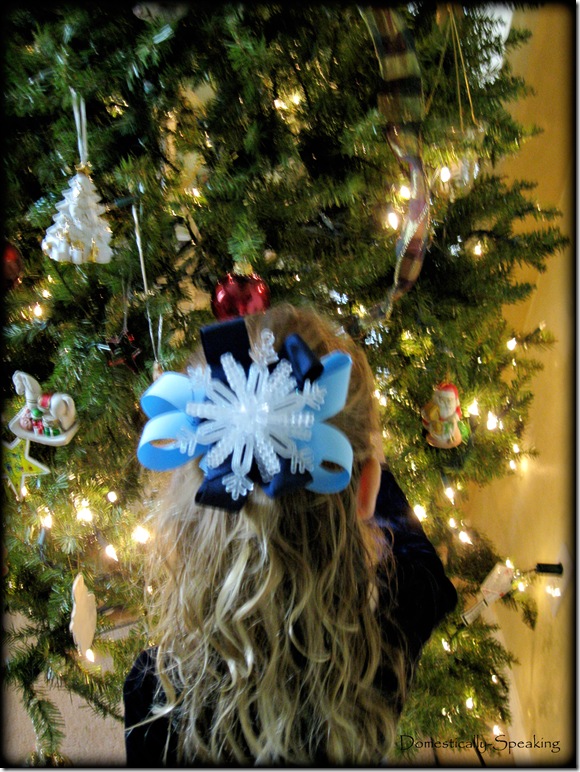 Make sure you cut your ends at a nice angle and then use Fray Check to keep the ends from fraying. Then I just hot glued the snowflake to the top of the ribbon. Here’s my 4-yr-old modeling for me.