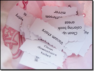 Recently I remembered something my mom did with me and my two brothers. Most Saturday mornings she would write down the chores she wanted done and then we’d take turns drawing out the chores that would be ours to do. Somehow it made chore time a little more fun.